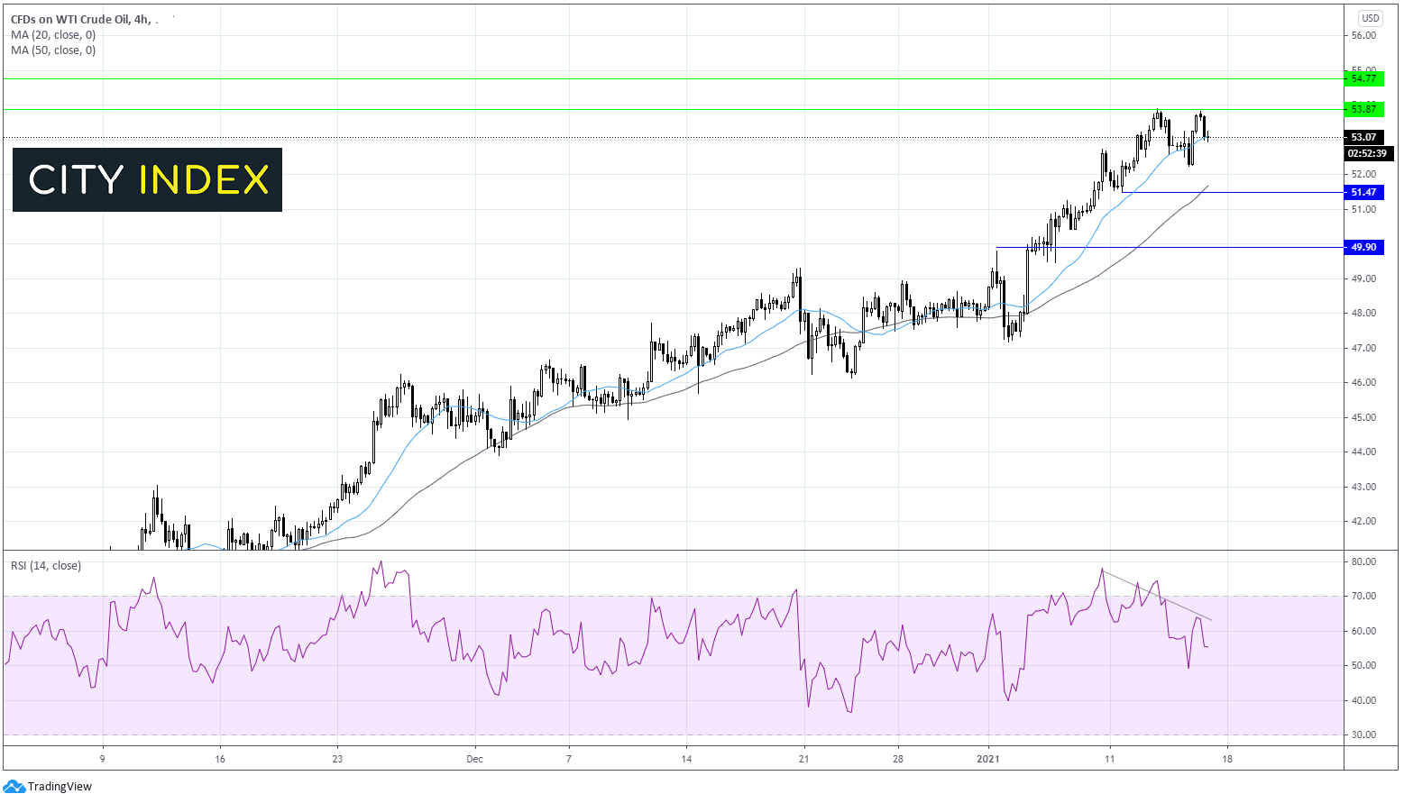 即使如此,油价整体趋势看涨,关键阻力分别在54和54.66(2020年高点)。逆转当前上涨趋势需要下破50。