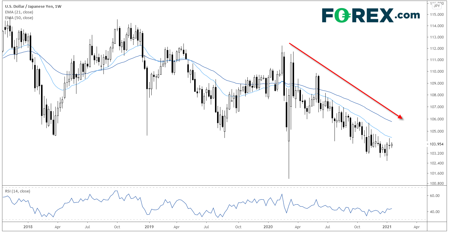 将注意力转到货币对周线图上,很明显,尽管交易员仍看跌美元/日元,但其走势较其他货币对要温和得多。这告诉我们,美元在过去一年中的疲弱走势首先(也是主要)归因于风险偏好升温,而对美国经济的担忧所起到的作用相对较小。尽管如此,鉴于汇价于21和51周均线下方交投走低,美元/日元较长线仍处于看跌趋势:来源: TradingView, GAIN Capital