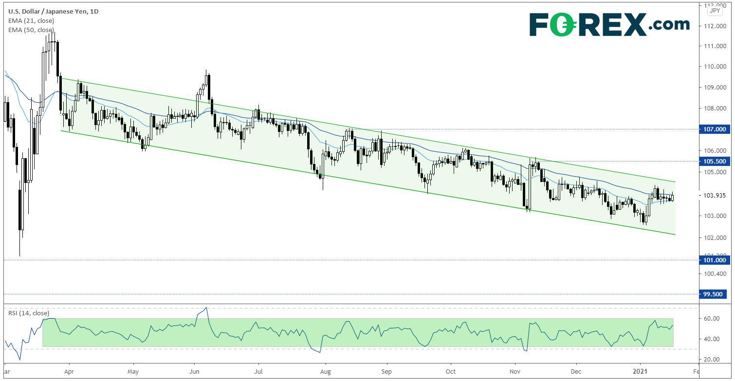 后市来看,只要看跌通道保持完好,阻力最小的路径仍为下行。从这个角度来看,读者可能考虑在汇价反弹攻向目前104.50附近通道顶部时的做空机会,随着第一季度的推进,汇价或下跌探向新冠病毒大流行低点101.00,心理支撑位100.00,甚至99.50附近7年低点。