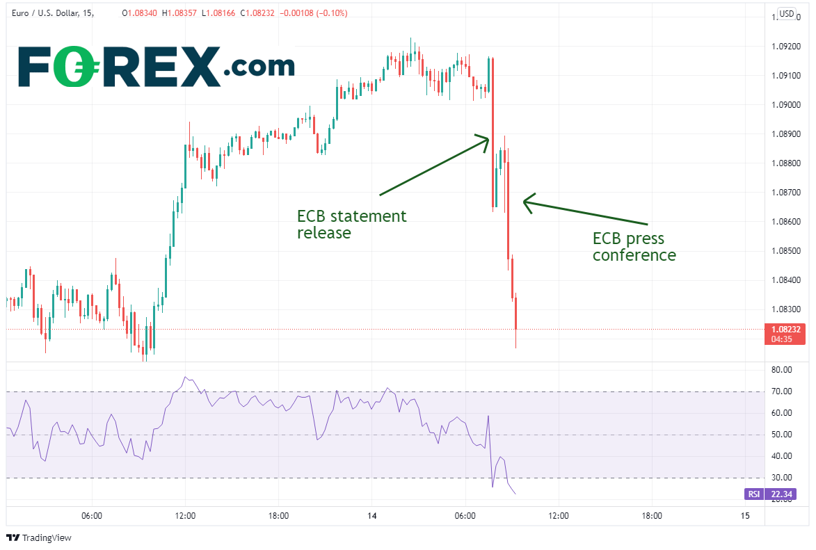 欧元/美元在欧洲央行货币政策声明甫一公布即下跌,在新闻发布会期间再度走弱。该货币对在央行声明揭晓之前交投于1.0916附近,近两个小时后创下盘中低点1.0757。