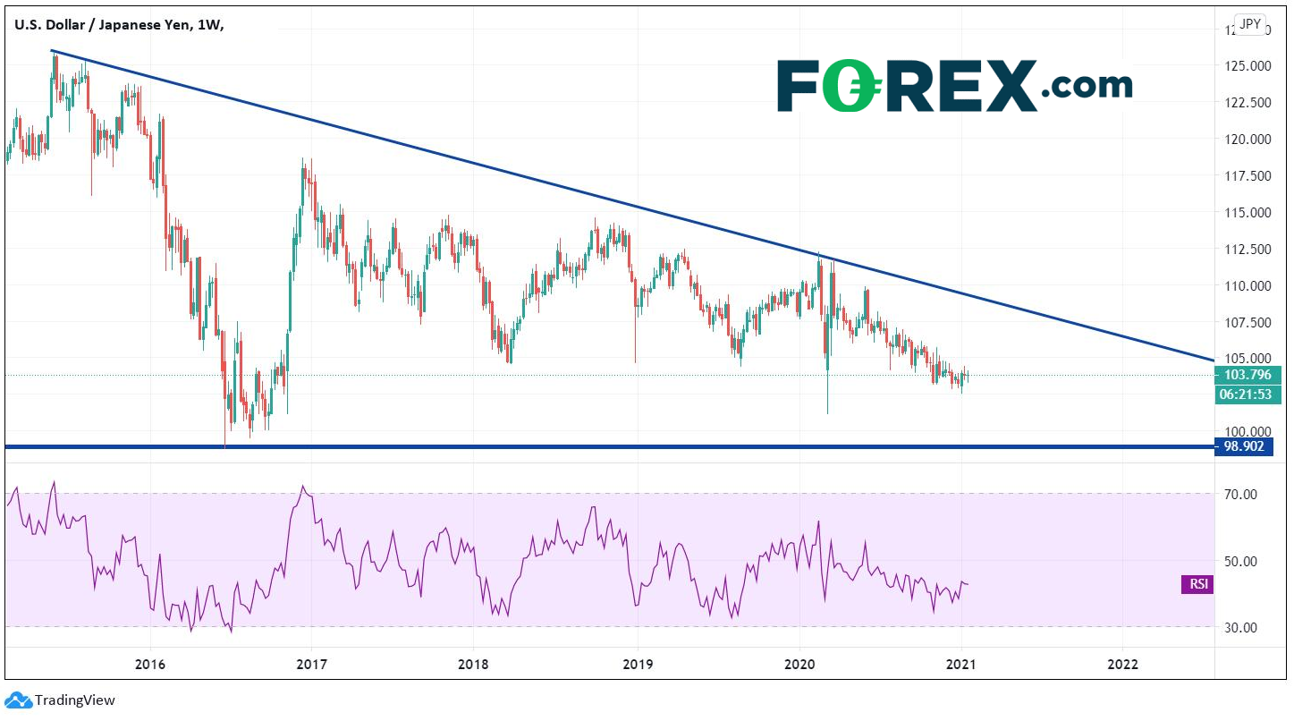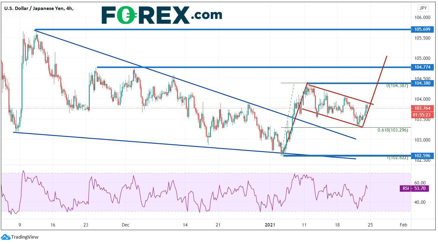 日线图时间框架来看,图表显示美元/日元在2月中旬至3月中旬大流行初期呈现极端波动行情,汇价自112.22探入101.18,接着又攻回111.71!货币对继续有序推低,截至2020年7月都处在下降楔形成形过程中。该楔形下斜趋势线顶部在104.50附近,这也是2020年11月11日高点至2021年1月6日低点跌幅之61.8%斐波拉契回档位。楔形底部趋势线在102.34附近,略低于1月6日低点102.59。
