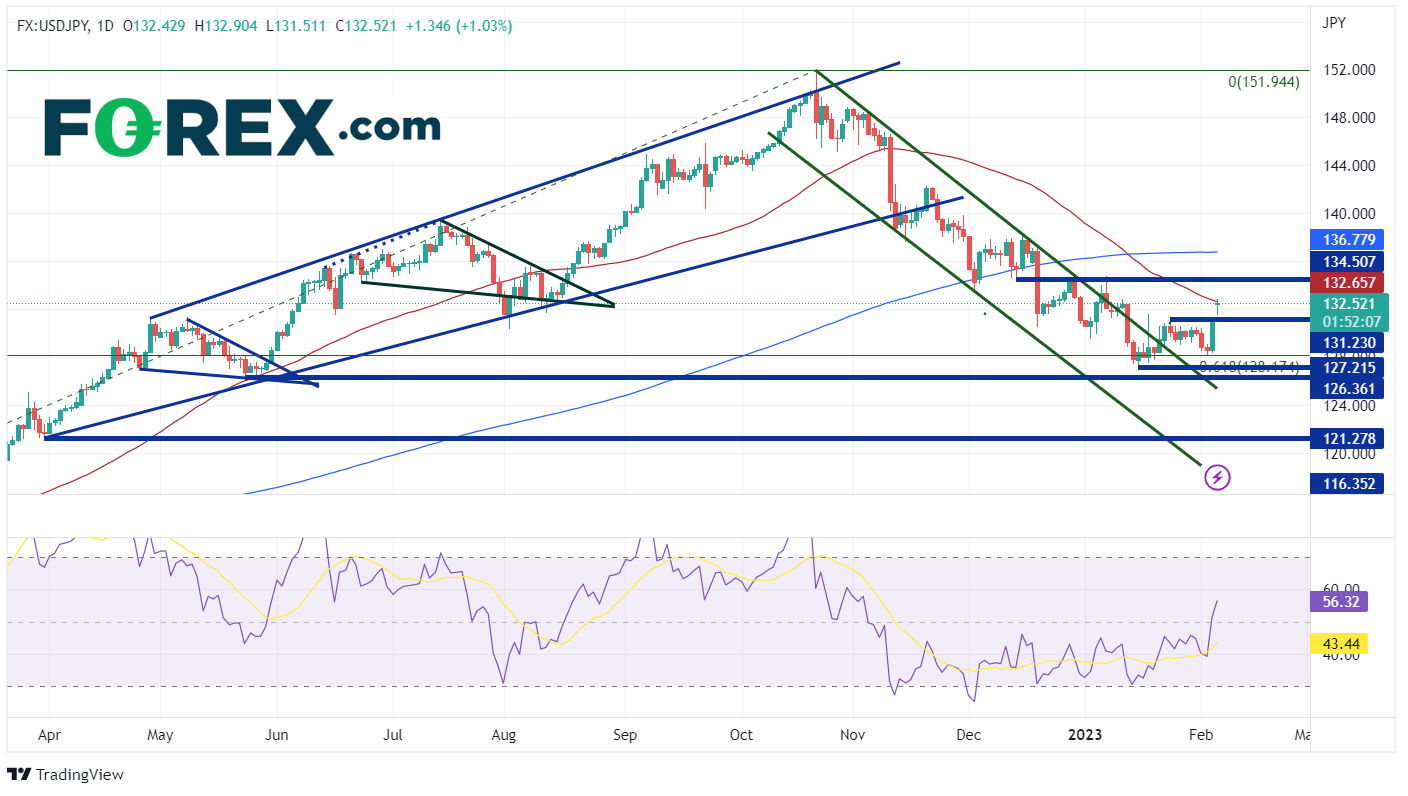 美元/日元自10月21日触及20年高点151.94以来一直在走低。该货币对在通道中稳步下跌,但于1月16日在2022年低点到2022年高点区间的61.8%斐波那契回撤位127.22附近得到支撑。此后,美元/日元一直交投于127.31至131.57的横向区间内。但在周一开盘后,该货币对跳空高开至区间上方的132.42,并交投于50日移动平均线132.65附近。