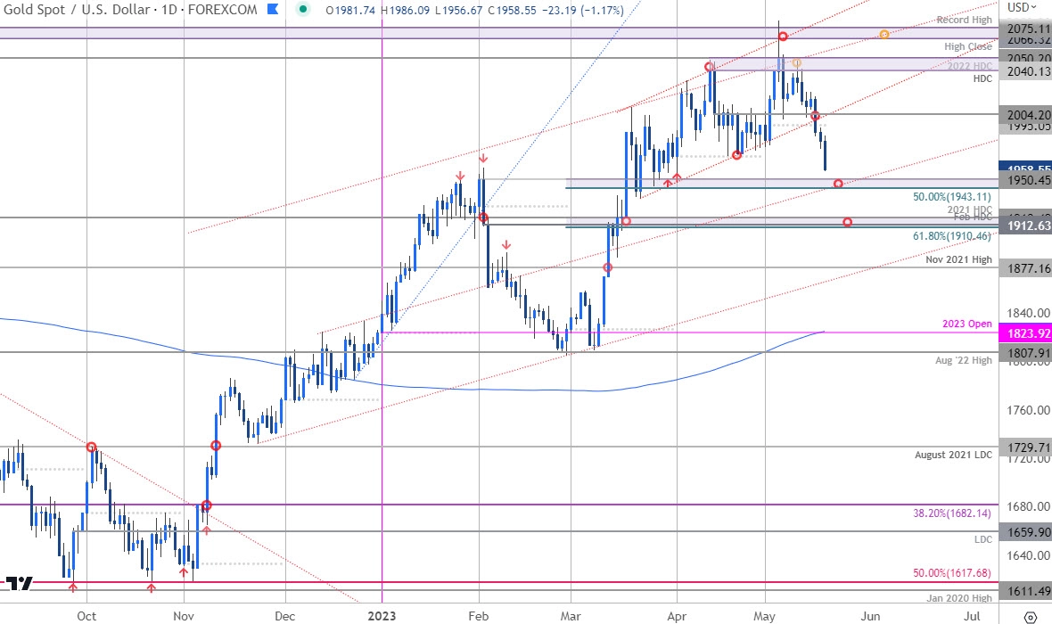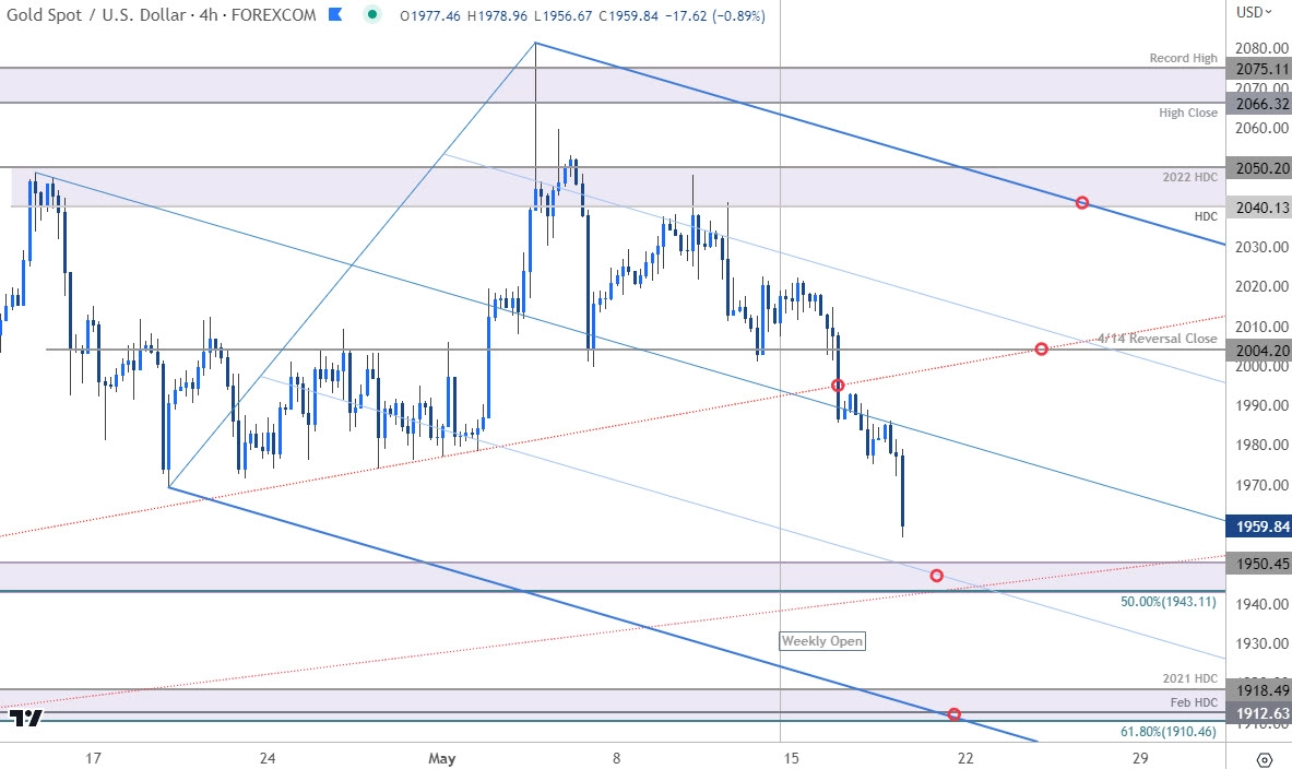 技术展望:在上个月的黄金价格短期展望中,我们注意到,“在持续的动能分歧中,已连续数周触及上行阻力位的反弹已经动摇,并可能导致金价进一步下跌。”最后一次尝试向上突破本月开盘价失败了,本周回落至月线开盘支撑位(1995)下方,这助长了我们所期待的下跌。价格下跌目前正接近我们正在追踪的两个主要支撑区域中的第一个,以了解可能出现的价格拐点。