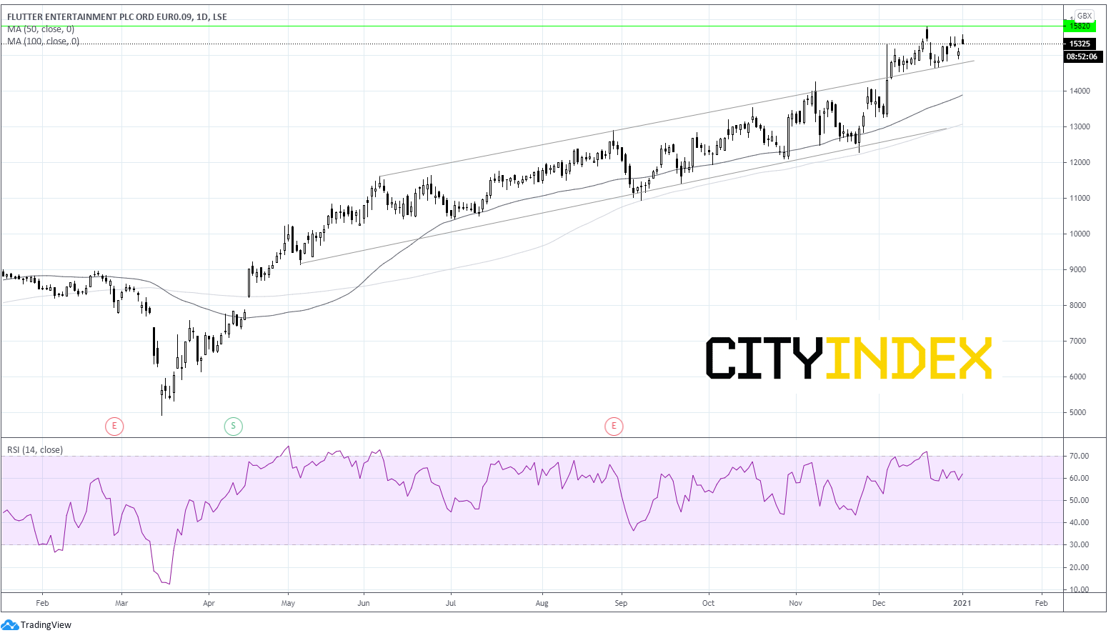 Flutter Entertainment自5月底以来股价一直交投于上升通道,12月向上突破此通道并一直守在趋势线上方,表明扩大上行可期。