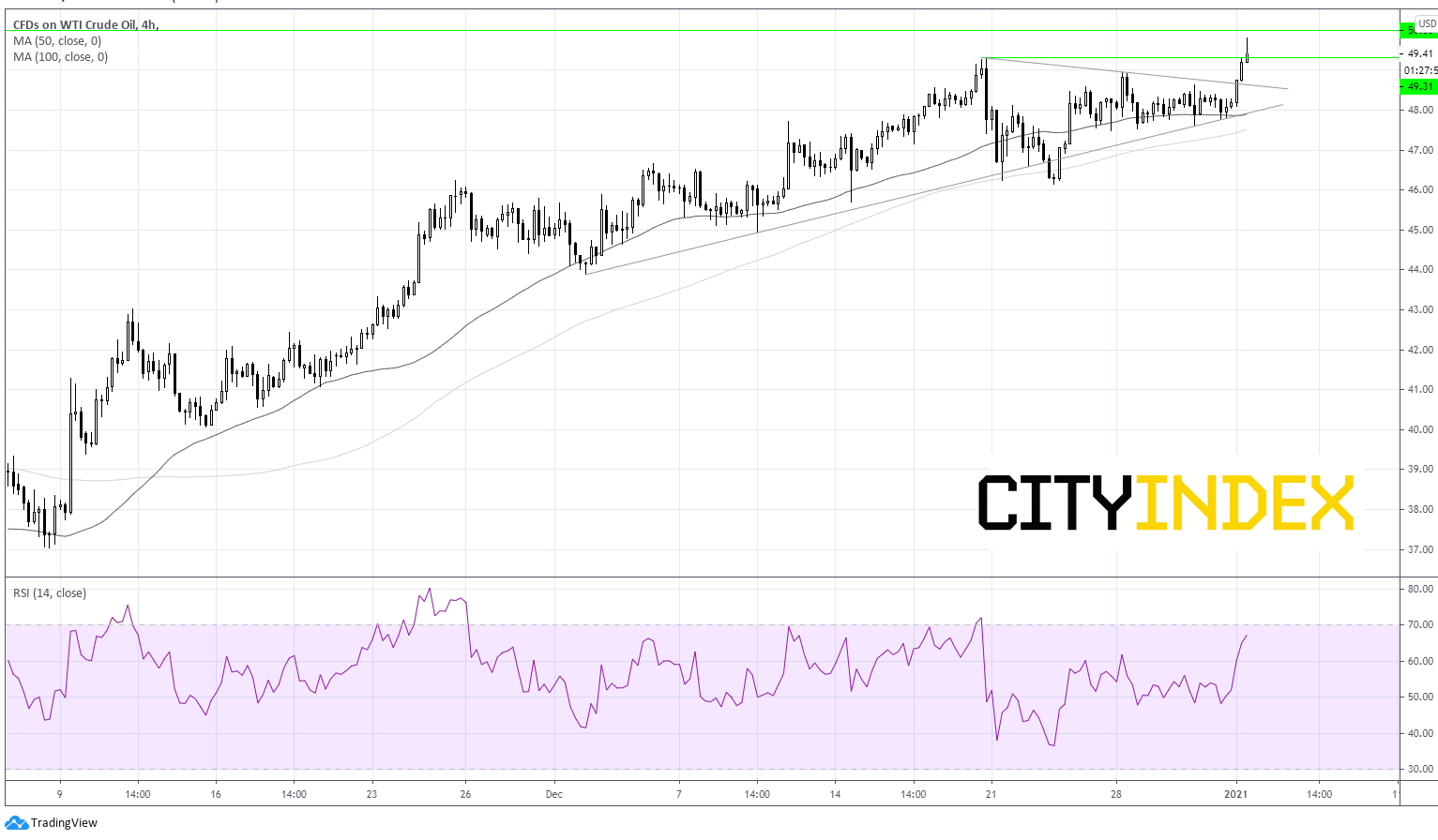 西得州原油报在49.50,上涨2.7%。油价4小时图当天站上20、50和100期均线,并已打破12月21日以来收缩的价格区间。