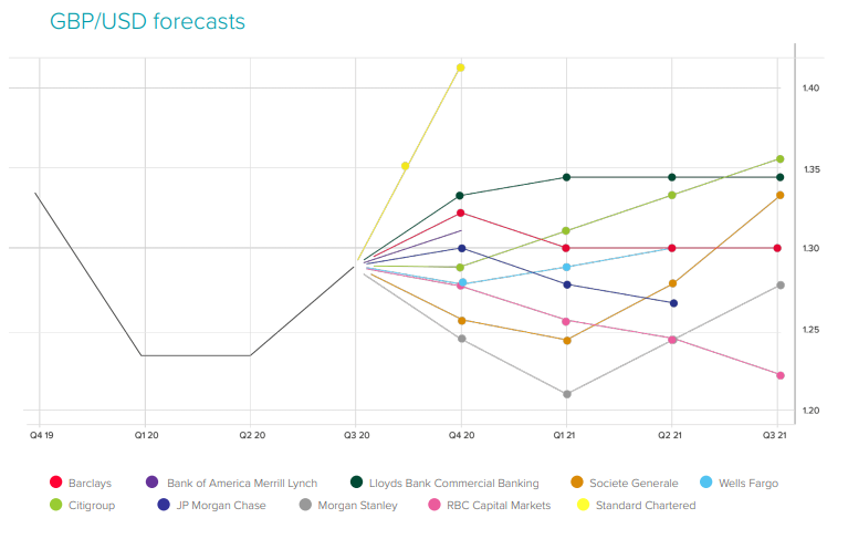 所以,英镑/美元有小幅上涨的可能性,但上行空间很可能受限。大部分投行预测英镑/美元在2021年年中前交投于1.25-1.35区间。