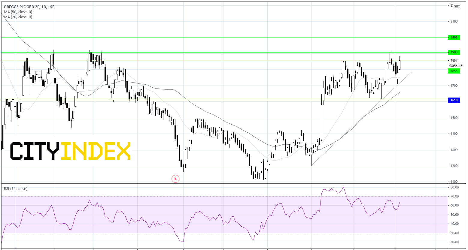Greggs目前位于20和50日均线上方,且高于11月初以来上行趋势线,表明看涨趋势已成形。