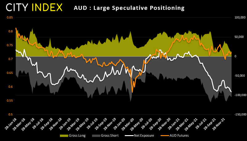 交易员售出1.8万份兑澳元的做空合约,减持多头合约249份,净空头创下9.15万份新纪录。尽管上周空仓略有上升,但空头敞口增加主要归因于11月底以来多头头寸被平仓。不过,尽管澳元看跌敞口增加,汇率整体仍走势坚挺,因此需看到价格转跌,否则空头将被迫平仓并有可能触发空头回补型反弹 (类似英镑期货近期走势)。