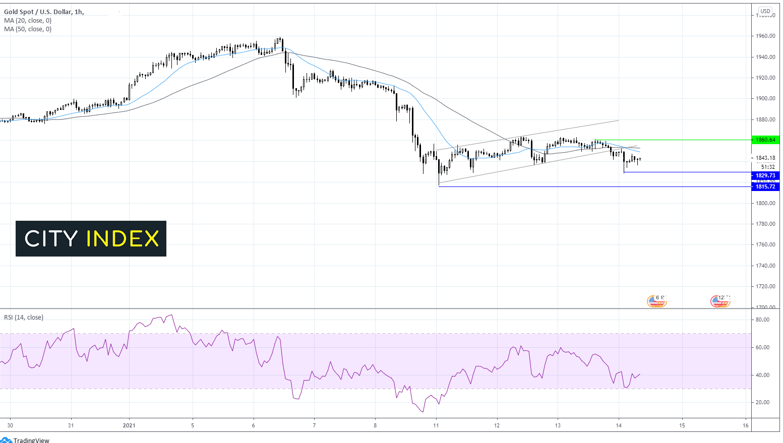 价格已自日低1828美元回升,但反弹努力或于20均线1847美元遇阻,然后是今日高点和50均线1852,水平支撑1860美元。