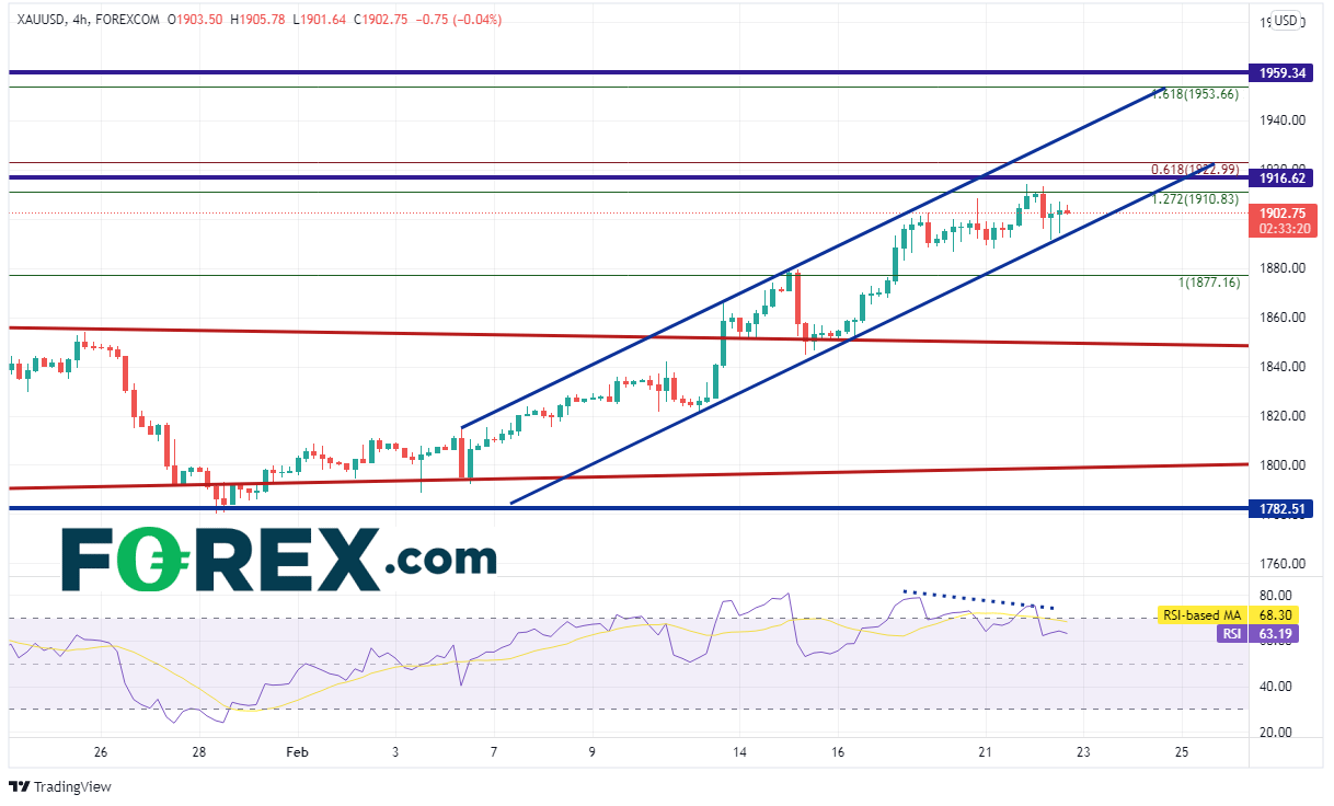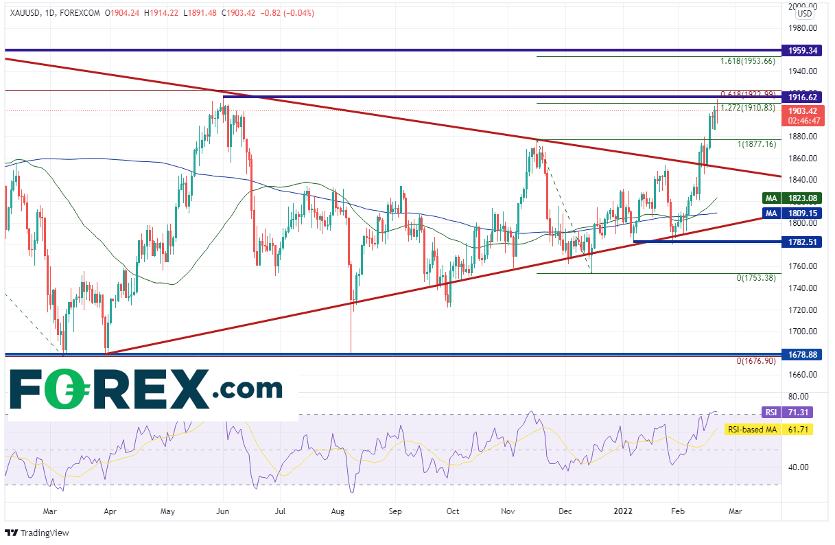 推动金价摸上攻此区域的动力不仅有对俄罗斯入侵乌克兰的担心,还有通胀的上升与情绪的作用。具体来说,最新《交易员持仓》报告显示,主动型基金的黄金多头持仓创下3个月之最。黄金价格今天最高摸至1914.22后调头回落,是否意味着后市下跌?