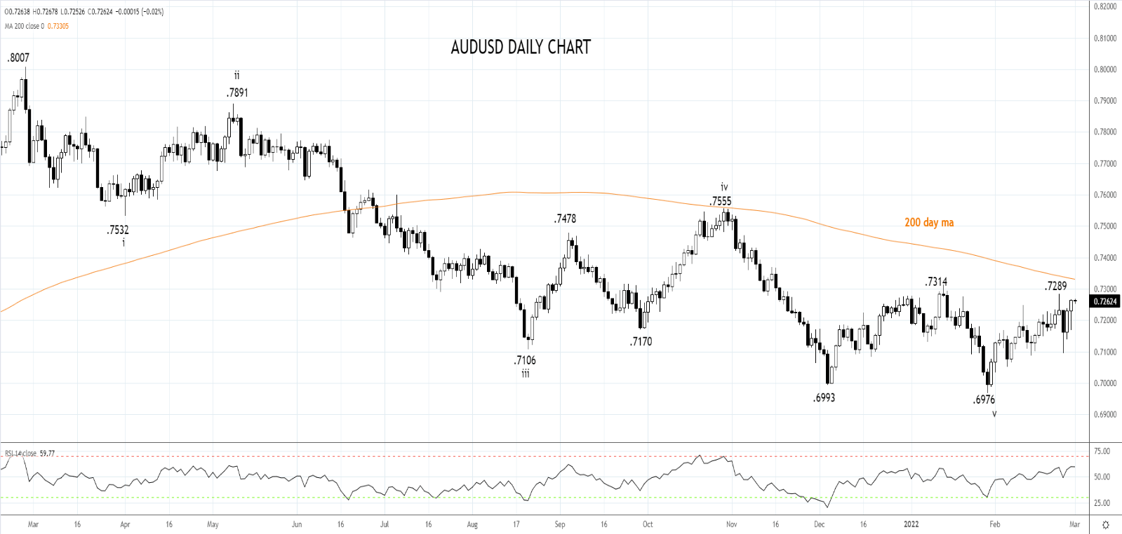 俄罗斯入侵乌克兰及紧随而至的制裁措施促使隔夜美联储加息周期鸽派重估,澳元/美元进一步获撑。美债收益率下跌12-17个基点,3月加息50个基点的可能性几乎消失殆尽。