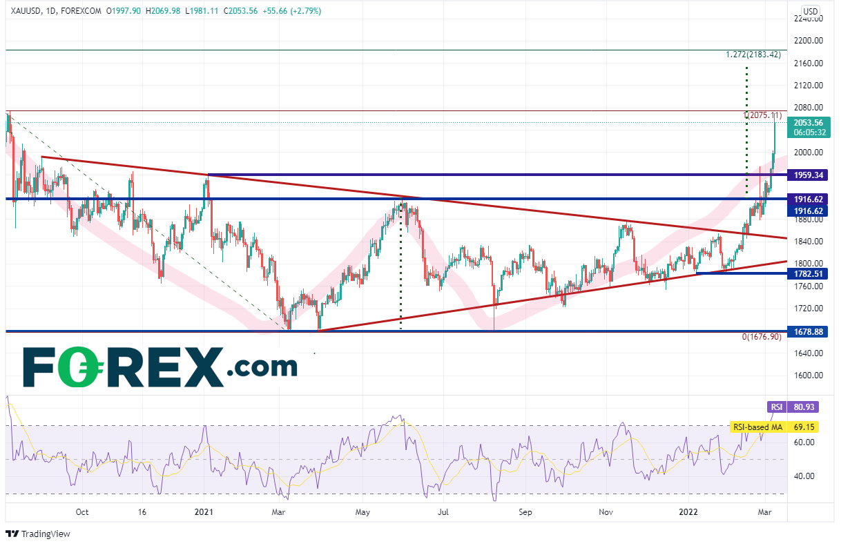 自从2020年8月创下历史高点以来,黄金(现货黄金/美元)一直交投于对称三角形内。该贵金属在2021年夏季于1678.88附近构筑双底后开始走高,2月11日站上三角形上轨趋势线,那是美国宣布俄罗斯可能随时侵入乌克兰的前一天。金价在2月底击穿双底颈线,随后一飞冲天。双底形态的目标在2153附近,但首先必须清除历史高点2075的障碍。请注意,日图RSI超买,表明金价可能准备回撤。