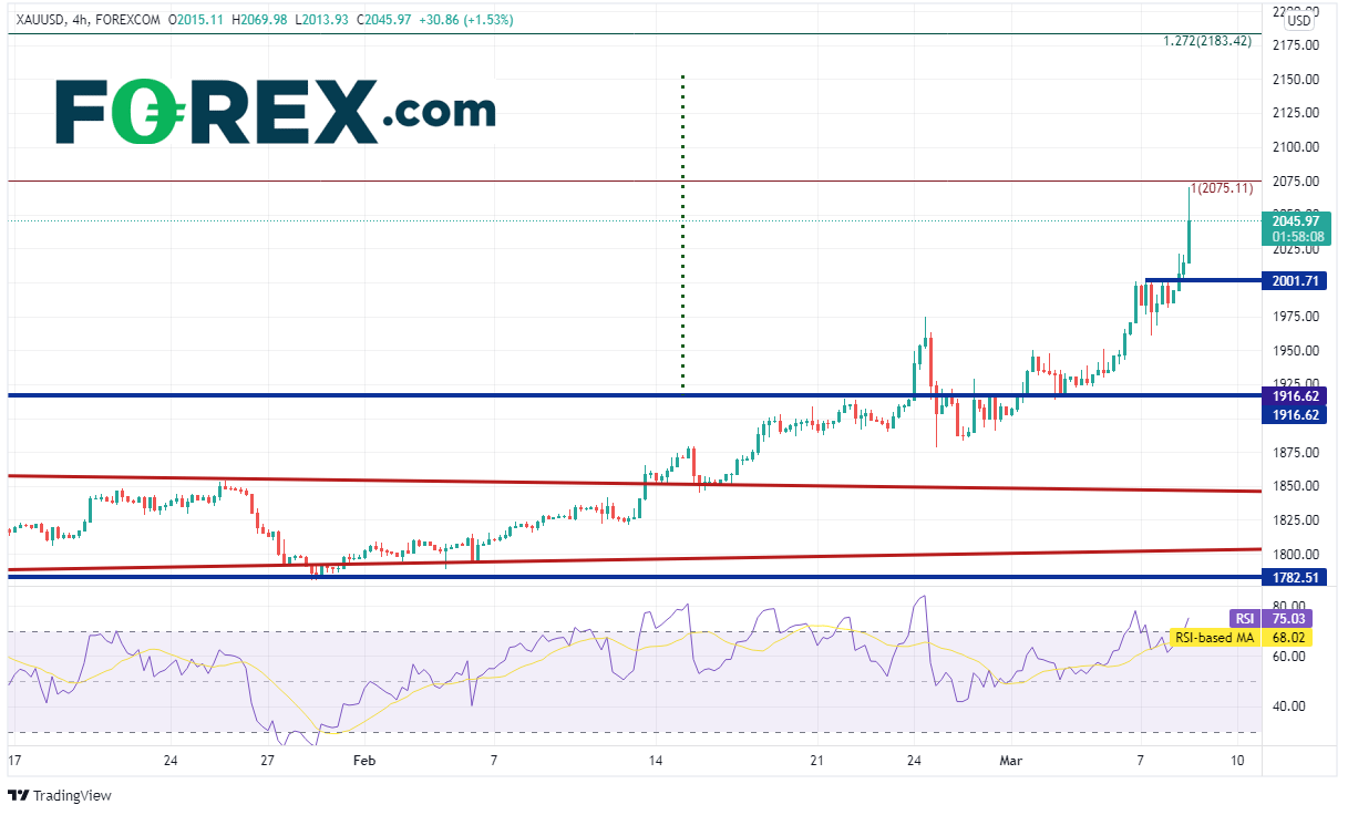 金价4小时图显示最新K线的波幅巨大,从2013低点劲涨至2069.98高点。上档第一个阻力位在历史高点2075.11,然后是双底目标2153、2020年8月高点到2021年夏季双底低点行情的127.2%扩展位2183.42附近。水平支撑位在2001.71和1950.27,如果失守,可以迅速跌至双底形态的颈线1916.62附近。