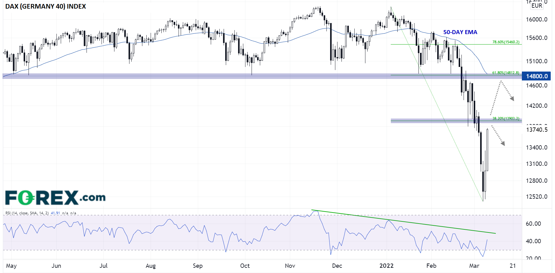 所以,DAX后市回落至13000下方并至少回踩低点也不足为怪。短线多头可能考虑获利回吐或短线空头可能考虑建立新头寸的逻辑区域方面,值得关注的关键价位将是今年跌势的38.2%回档位13900。如果短线上涨动能可以攻克该区域,或上看14800附近的阻力带,其由61.8%回档位、50天指数移动均线、前支撑现阻力位组成。只有站上14800,才可能消除DAX的中线下跌动能,交易者从而相信已构筑坚固底部。