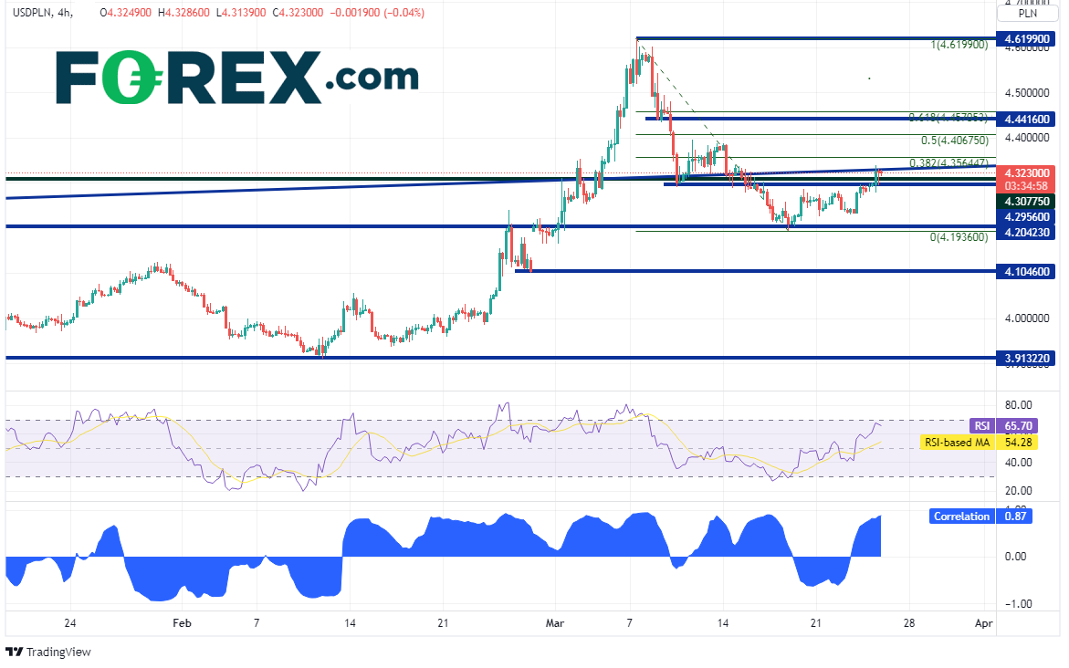 美元/波兰兹罗提和黄金之间存在高度正相关联系,目前两者的相关系数报在+0.81。高于+0.80的读数都被视为高相关性。美元/波兰兹罗提在俄罗斯入侵乌克兰后和黄金一样开始大举走高,于3月2日站上4.3078的前历史高点后攻城略地,在3月7日创下历史新高4.6199。该货币对此后回落至水平支撑位4.2042并且再度上扬。