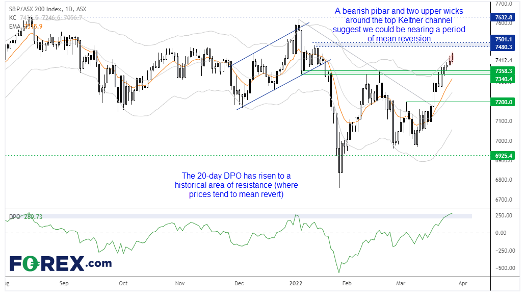 ASX200指数正在缓步走高,但看起来不可避免要回归均值。昨天时段初未能站上keltner带上轨,收出的看跌pinbar落在keltner带上轨之内。周五的上涨有一半构成上影线,最终表明当天高点处市场想法发生了转变。这是否利于逆势交易尚待商榷,但我们要提请多头谨慎。离场观望也没有问题,判断是否回归均值后再在7340/58等支撑区域附近寻找新的做多机会。