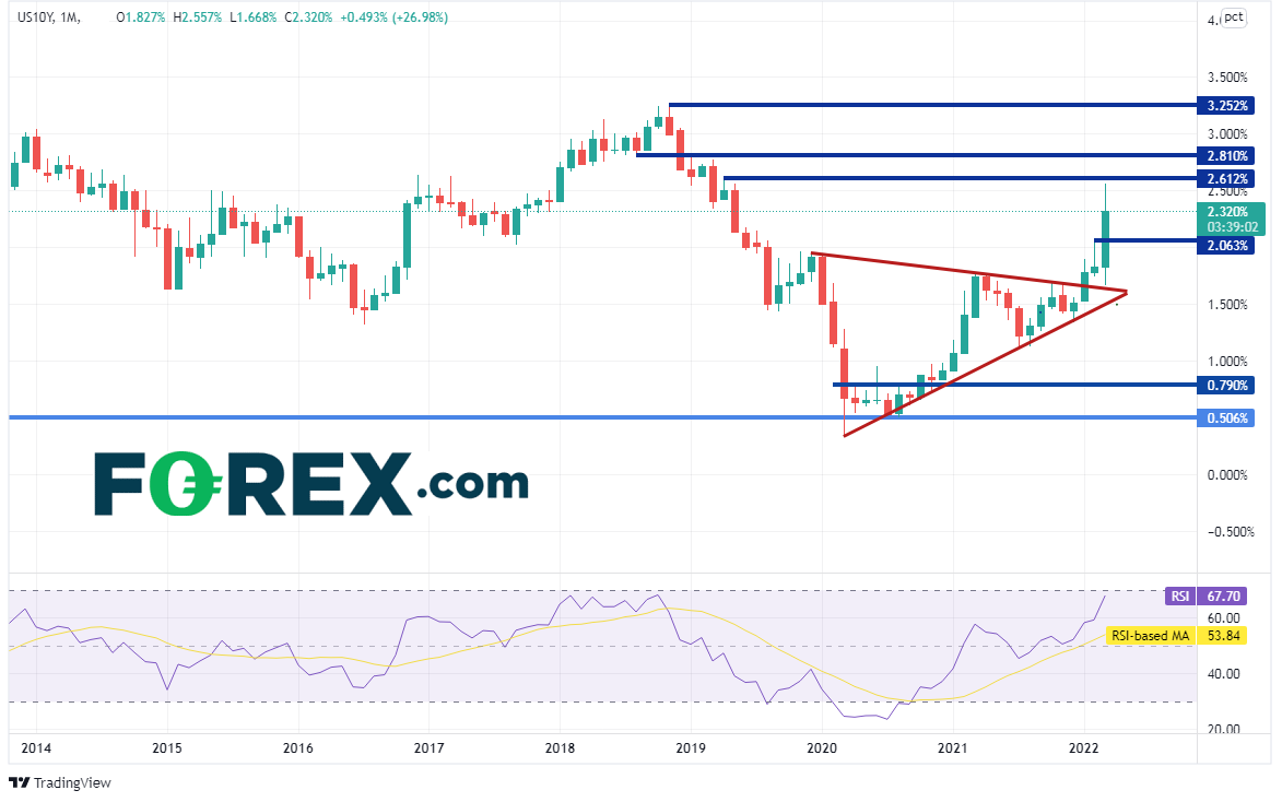 基准10年期美债收益率月图大涨。继2020年3月创下疫情期间低点0.333%后,收益率开始上涨并形成对称三角形,1月10日在1.67%附近打破此形态,但最高止步于2%,之后回踩三角形上轨趋势线。3月份,10年期美债收益率开盘报在1.827%,最高摸至2.557%,收在2.323%附近,当月涨幅超过27%。上方阻力有水平阻力位2.612%、2.81%和3.25%。支撑位在2月高点2.063%、3月低点1.668%。