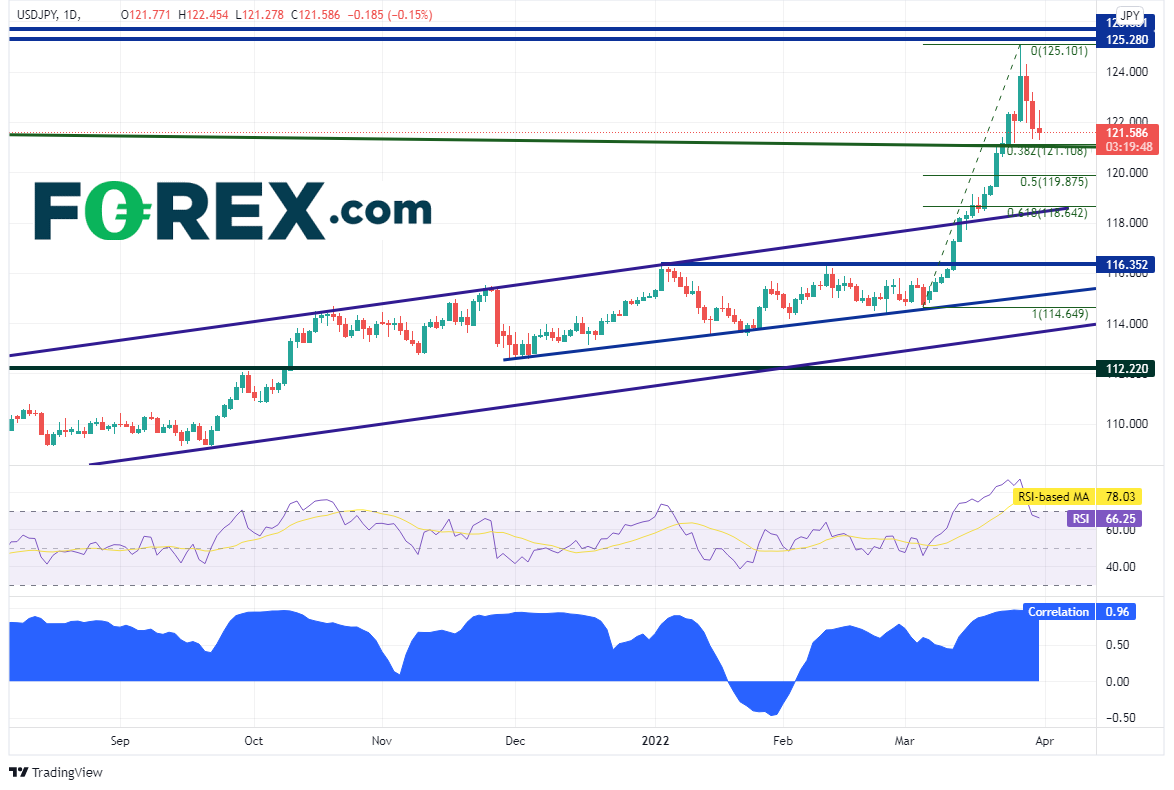 美元/日元的轨迹和美国10年期美债收益率差不多,3月中旬以来更加趋同。请注意,下图显示美元/日元和美国10年期国债收益率当前相关系数为+0.96。报在+1.00表明两种交易产品在100%的时间里同向波动,而+0.96已经非常接近于+1.00。所以,如果希望交易收益率,方法之一是借道美元/日元。美元/日元日图自2021年年初以来一直交投于一个上升通道内,3月11日在118.21附近站上通道并拓展反弹,本周初摸至125.10高点。价格此后回撤,截至目前守住2002年以来趋势线支撑(请看绿色线)和3月4日低点到3月28日高点行情的38.2%回档位121.10附近。