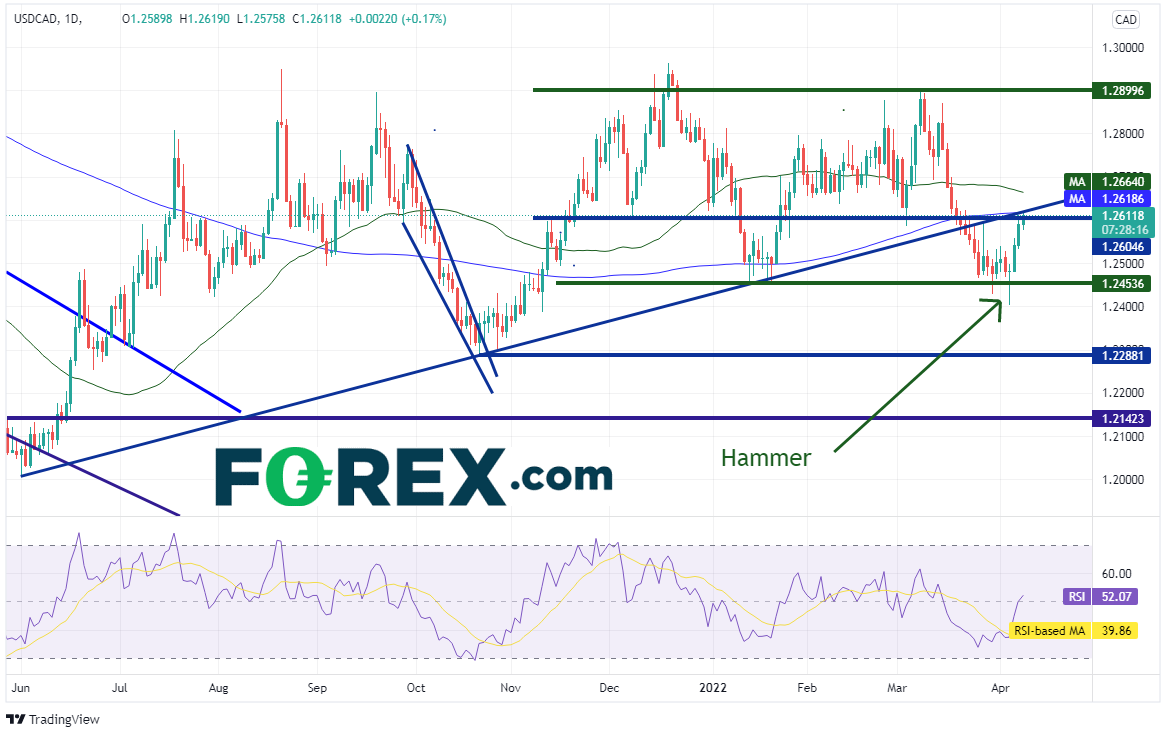 美元/加元自2021年11月中旬以来一直交投于1.2450-1.2900(请看绿色线)区间,于12月中旬尝试击穿该横盘通道的上轨,最近则在上上周试图下破通道下轨,但均以失败告终。价格在4月5日形成锤子形态后不断走高,目前交投于水平阻力位、2021年6月1日以来上斜趋势线与200天均线附近,即1.2620一线。