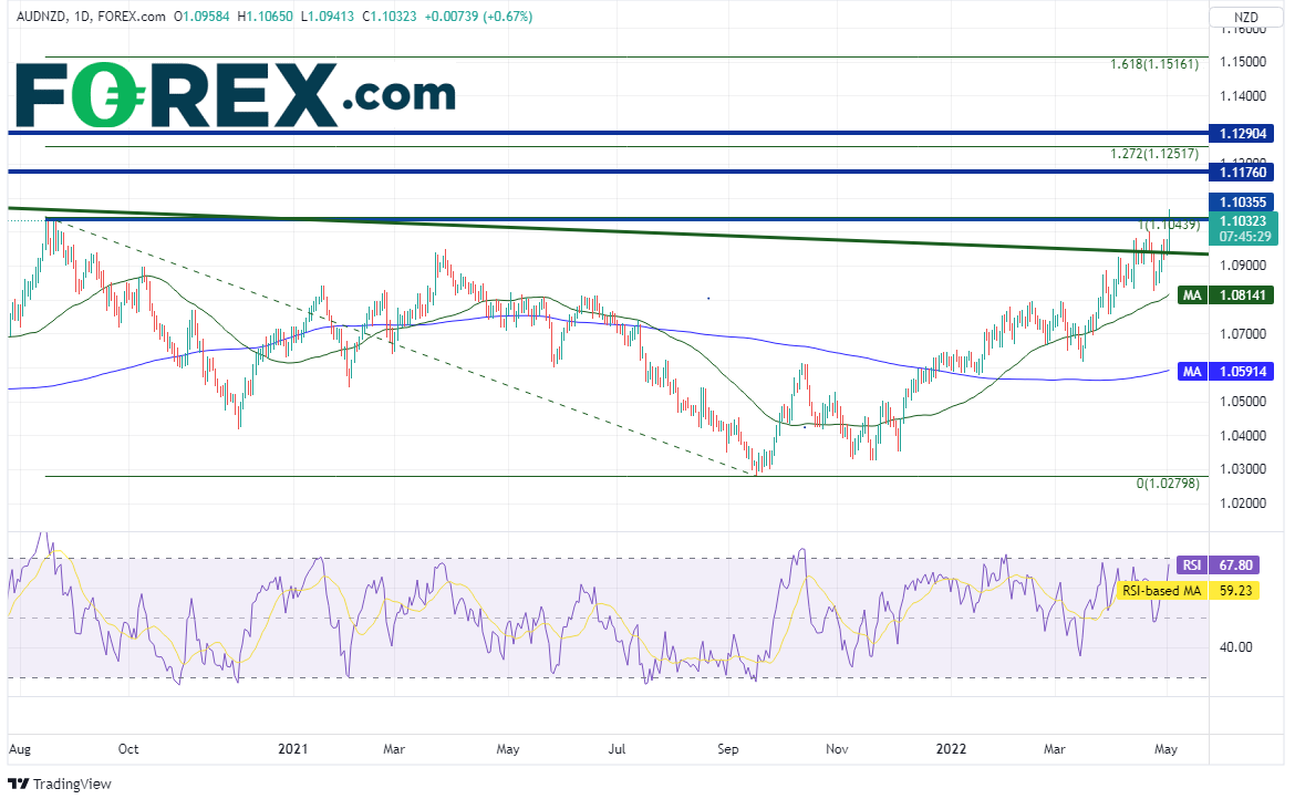 该货币对周图自2013年10月以来有序下跌,形成下降通道(请看绿色线条)。过去几周测试了通道的上轨趋势线所在的1.0925附近,今天在澳洲联储决议的刺激下暴涨并攻克通道上轨趋势线,还突破了水平阻力位1.0439,创下2018年8月以来最高点。但请注意,RSI正处于超买区域,表明价格长线或准备回撤。