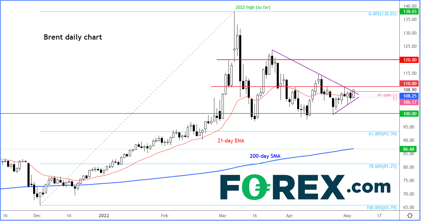 事实上,布伦特原油在其心理大关与21天指数移动均线上方盘整数周后似已在100.00附近筑底,如果明确站上图表所示的趋势线,或再上台阶,进入110-120区间。