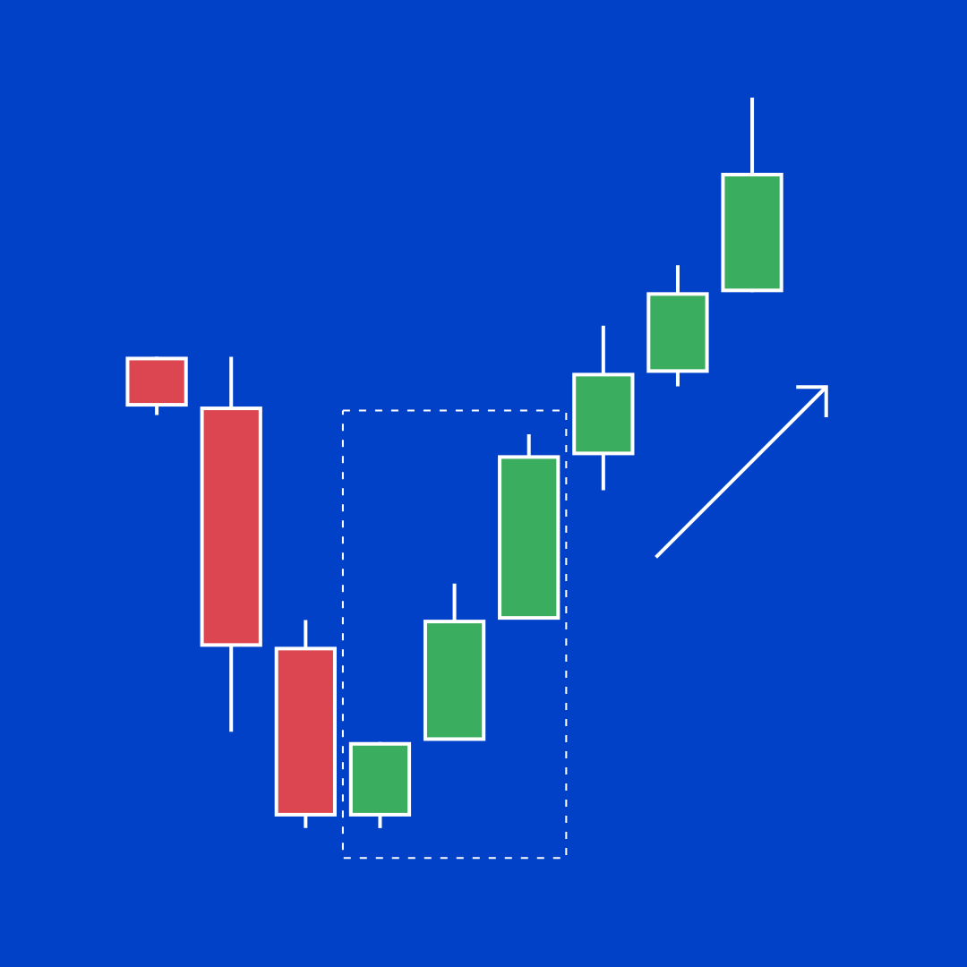 - 三根实体较小的阳线,悉数落于第一根蜡烛的范围内