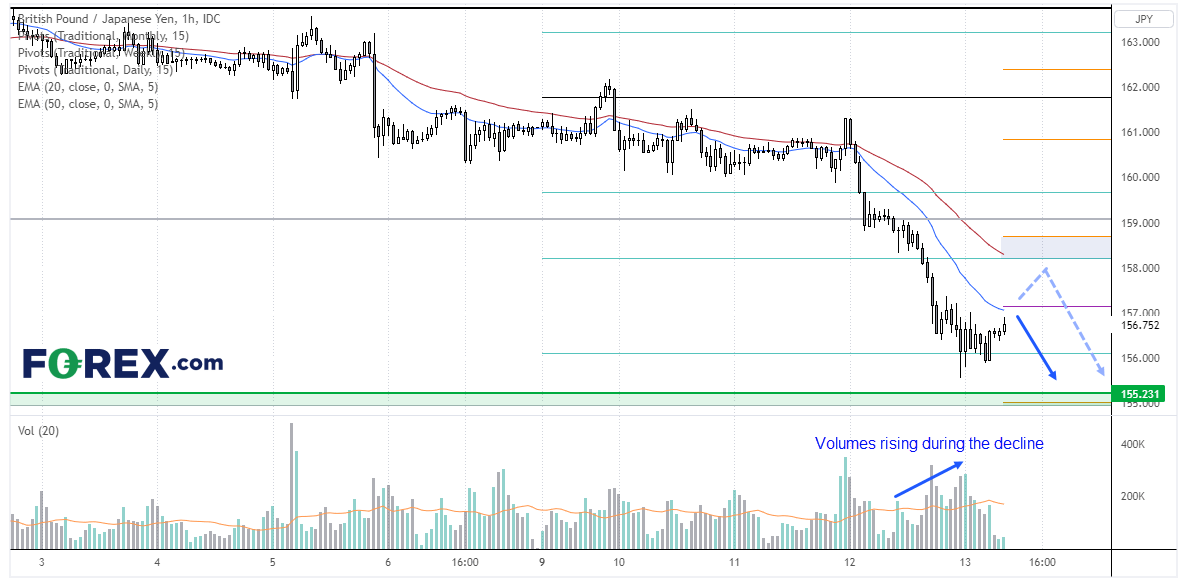 英镑/日元和多个日元货币对一样小时图处于强劲的下跌趋势中,只是现在处于修正阶段。今天时段可能交投平静,那欧洲时段可能就值得关注了。我们在寻找于20小时指数移动均线及日图枢轴点157附近构筑波段顶部的证据,如果确实上冲,则寻找在158附近构筑波段高点的证据。158在周图第二个中枢阻力位和50小时指数移动均线下方。