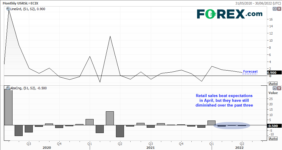 而在美国一季度经济意外萎缩1.4%后看到昨天发布的4月零售销售好于预期,市场自是大为欣慰。4月零售销售增长0.9%(预期增0.6%),而且3月数值上修至1.4%。占据整体读数37.5%的汽车与零部件销售增加2.2%,而核心零售销售上涨1%;工业产出也升至半年高点1.1%。这些数据使得市场存有这样的期待,即二季度GDP或许不会萎缩。