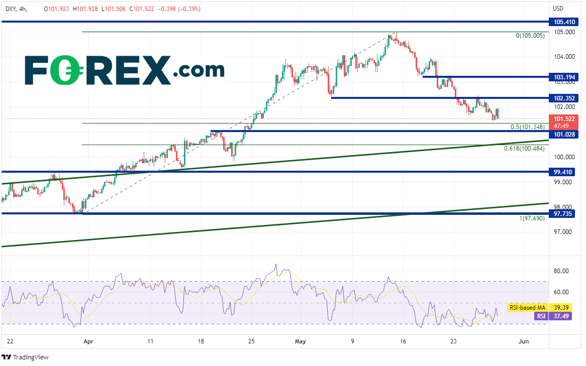 美元指数4小时图回撤至3月31日低点到5月8日高点行情的50%回档位,即101.34附近上方不远处。下方是4月19日以来水平支撑位101.03,然后是由长期上涨通道上轨趋势线和前述行情的61.8%回档位组成的支撑位带,即100.50附近。第一个阻力位在5月5日低点102.35附近,然后是5月18日低点103.19,接着是5月8日高点105.00。