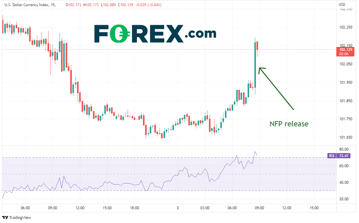 上述数据推高美元,带动美元指数自101.92 涨至 102.19。交易者看到该好消息的第一反应是“糟糕,美联储得到了好于预期的表面数字和持平的平均每小时收入这两件完美的武器”。