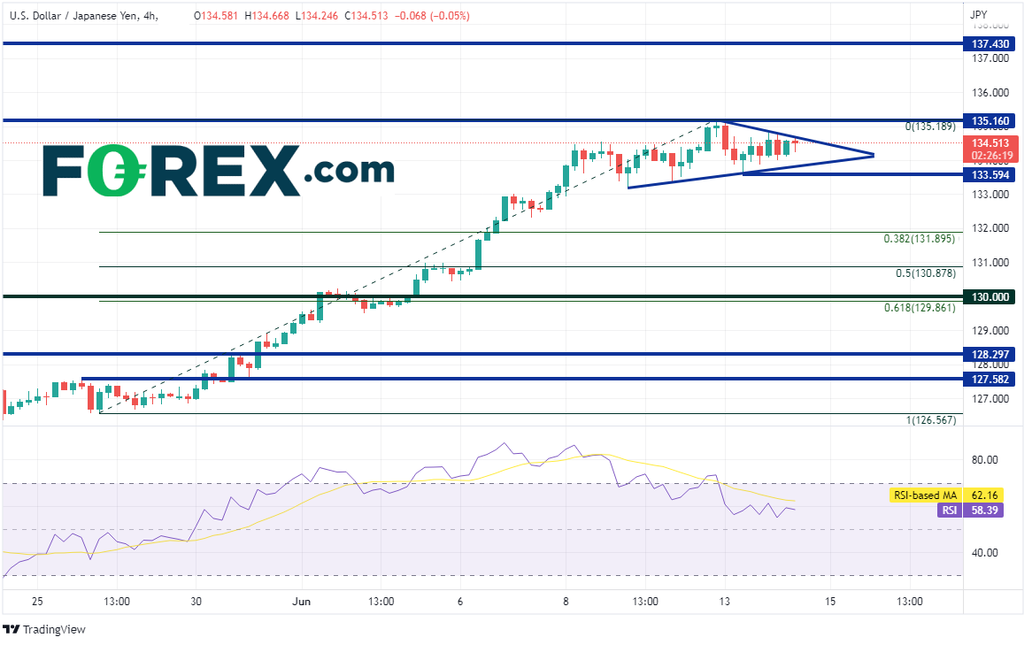 美元/日元4小时图从昨天新高回落,仍然处于对称三角形内。但虽因日本官员口头打压而回落,也只是回到133.59,且此后始终保持在三角形内。第一阻力在通道的上轨下降趋势线,然后是6月13日高点139.19,往上再无阻力,直至1998年以来水平阻力位137.43。然而,如果在诸如FOMC不及预期强硬或日本官员进一步口头干预等因素作用下调头走低,则第一支撑位在形态的下轨上升趋势线133.85附近,如果攻克,可能跌至6月13日以来低点133.59,以及5月9日低点到6月13日高点行情的38.2%回档位,即131.90附近。
