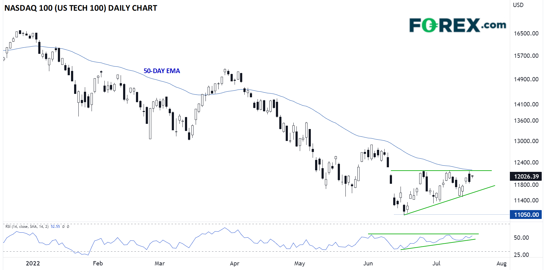 技术面看,多头在过去一周止住了纳斯达克100指数的下滑势头。下图显示,自从6月中旬考验了11,000,股指形成了系列上抬的低点。不过,价格到目前为止都没有攻克由前阻力位与50天指数移动均线组成的阻力带12,200。