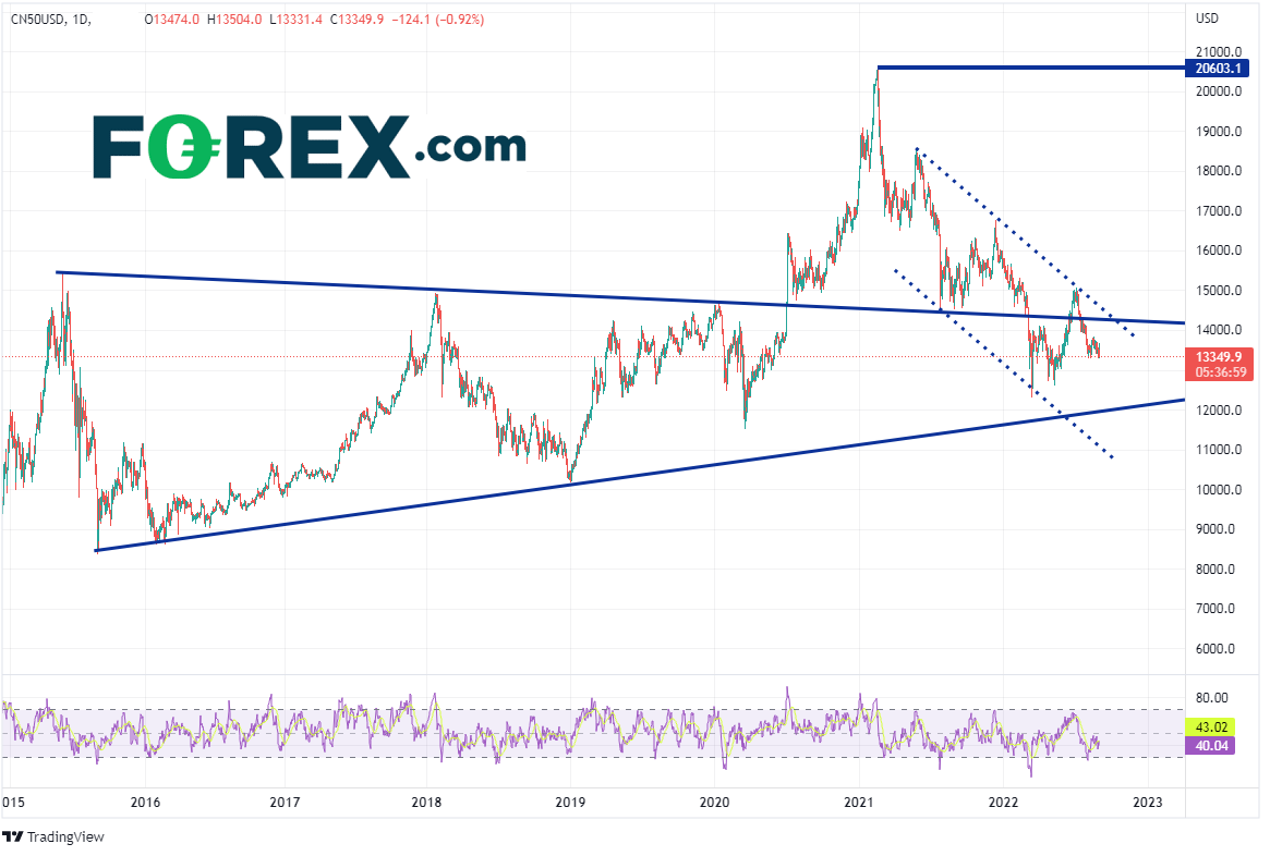 中国A50指数自2015年6月中旬以来一直交投于对称三角形内,但在2020年7月3日击穿14700附近的上轨,在2021年2月18日之前创下20603.10历史高点。股指自那以后不断下跌,受困于通胀、经济增长放慢、新冠病例数增加的关切。价格无数次考验前文提到的长期三角形的上轨趋势线,最终于2022年3月7日击穿。2021年5月以来,中国A50指数的走势也形成下降通道,在今年3月中旬于13186形成短线低点。