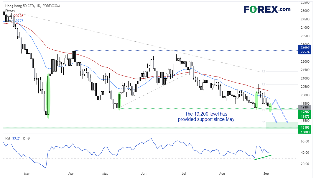 另外,在负面情绪包围中,恒指昨天假性下破19,200支撑区域且当天收出一根锤子阳线。值得注意的是,锤子阳线形成并收于关键支撑位之上,也收上周图第一支撑中枢。而且,RSI与价格形成看涨背离。