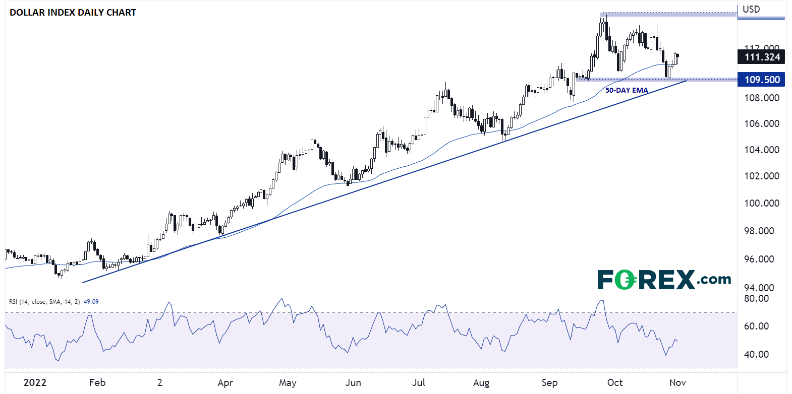 美联储会议对美元影响将最为显著。美元指数今年前三季度都形成了明显的持续上行趋势,但10月上涨乏力,现正试探50日指数移动均线和上行趋势线形成的下方支撑。若有迹象表明12月仅加息50个基点,美元或将跌破109.50这一关键支撑位区域,向108.00回调。但若有消息称利率将继续全速上涨,美元则会重拾升势,重回114.00上方的近期高点。
