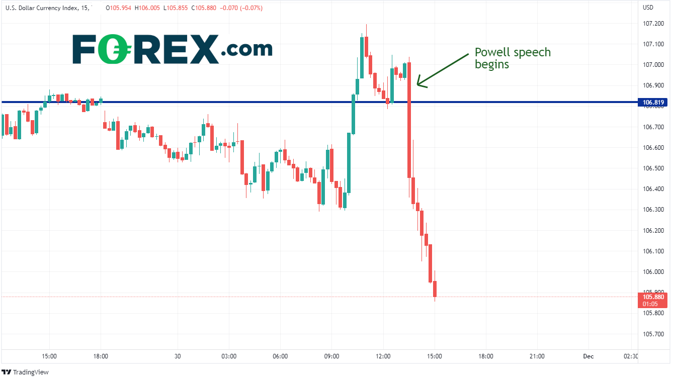 受鲍威尔鸽派讲话影响,美元指数骤跌。在鲍威尔发表演讲前,美元指数在107点附近交投,一个半小时后,美元指数跌至106点下方。