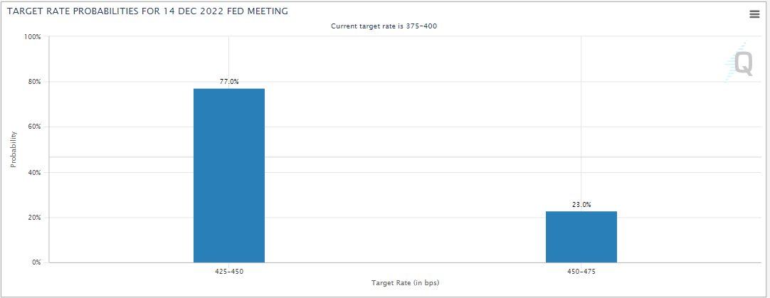 根据芝商所FedWatch工具数据,八成的联邦基金期货交易者认为此次将加息50个基点,余下约20%的投资者则认为还有加息75个基点的可能。