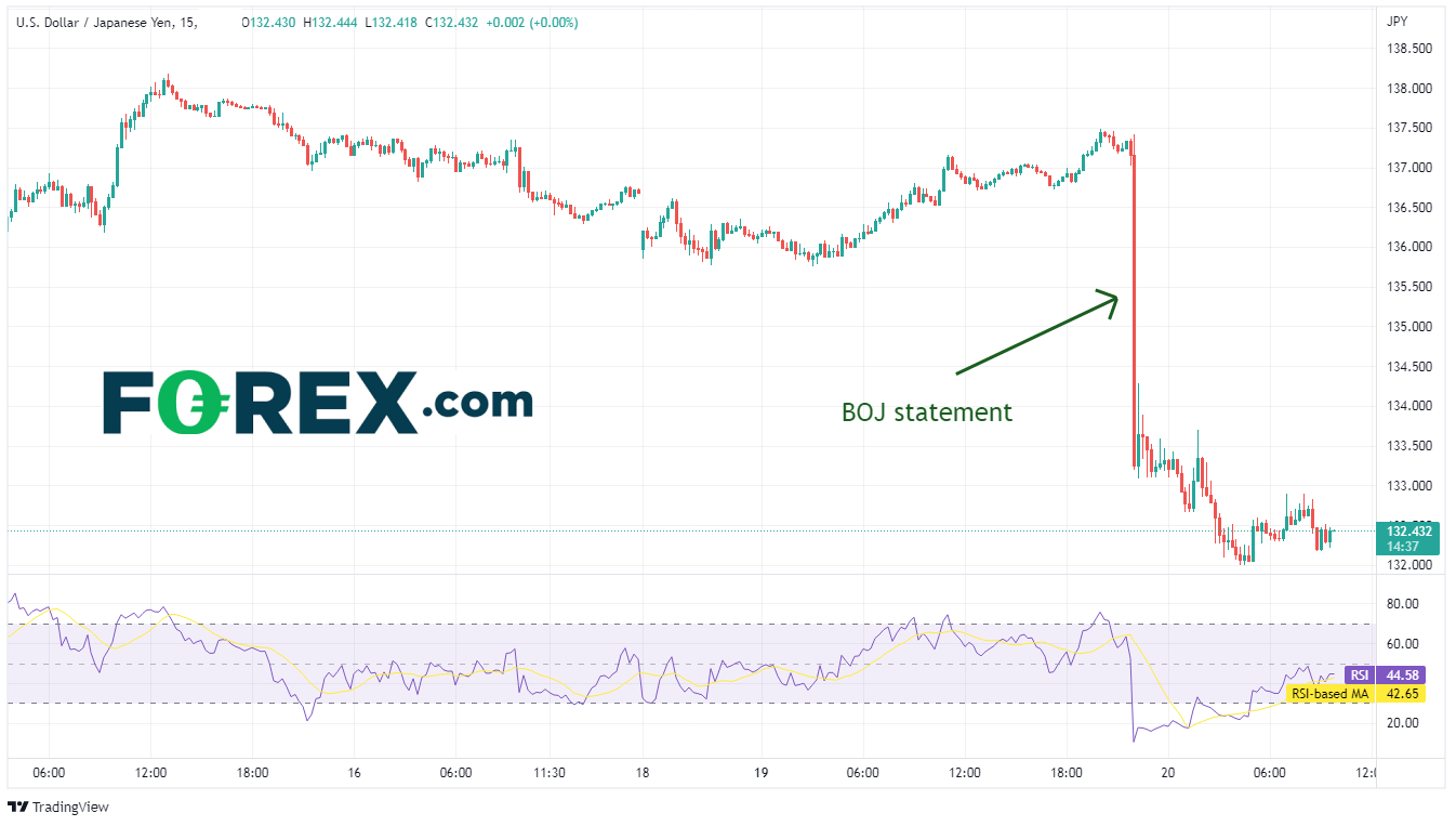 日本央行声明发布后,美元/日元承受大幅抛压,从137.41跌至133.19,波动幅度接近3%。