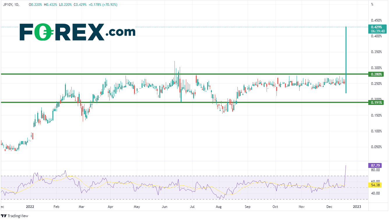 美元/日元并非唯一受日本央行声明影响的市场,10年期日本国债收益率飙升。今年的大部分时间,10年期日本国债收益率一直在0.19%和0.28%之间窄幅波动,但日本央行周二的声明直接刺激收益率从0.22%升至0.43%的盘中高点!