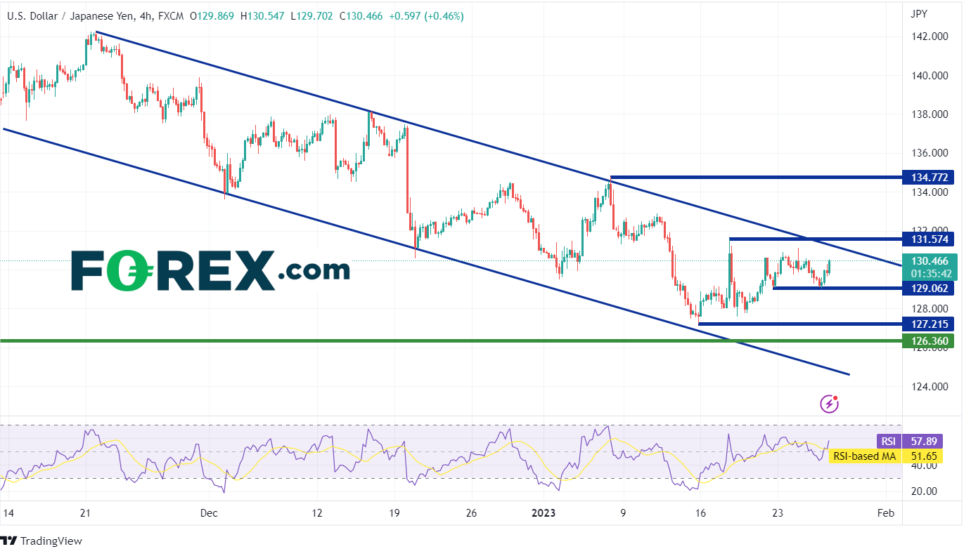 美元/日元自2022年10月21日创下2022年高点以来,一直在通道中稳步走低。该货币对跌至2022年低点到2022年高点区间的61.8%斐波那契回撤位128.17附近。2023年初,美元/日元开始在通道内形成下降楔形。该货币对在1月18日日本央行会议后开始横向冲破楔形和通道。自会议以来,价格一直在127.56和131.57之间振荡。