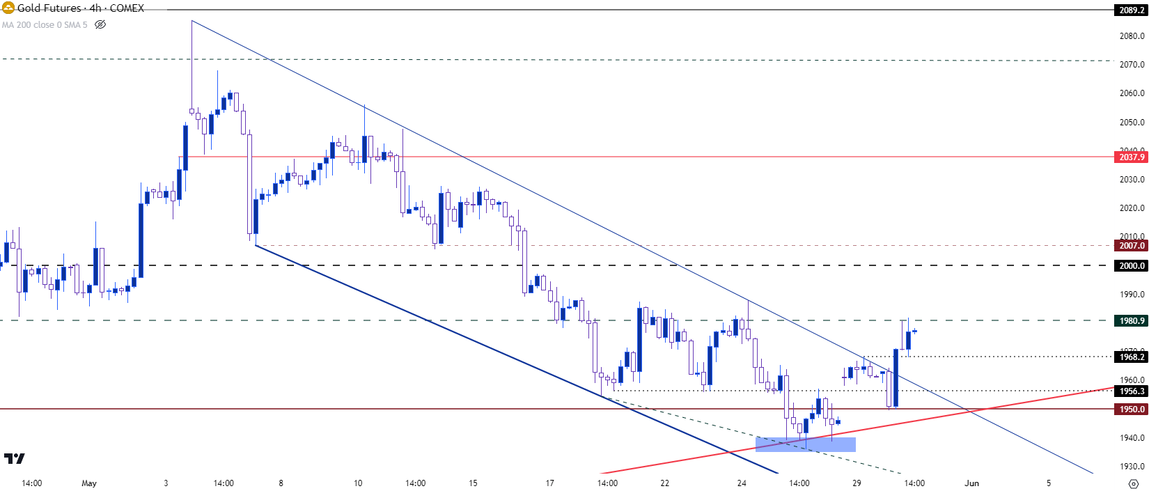 本周开始,金价从趋势线强劲反弹。该趋势线在上周四开始发挥作用,并在上周收盘时经受测试;但本周价格跳空高开,并守住1950支撑位,随后冲击1981阻力位。