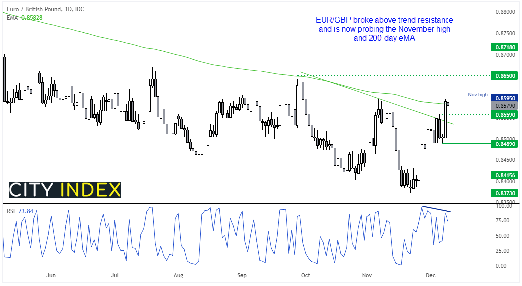 欧元/英镑在今天欧盘启动前正处在一个技术面关口。货币对昨天创10周以来最佳表现,反弹1%,不过已于11月高点和200天均线遇阻。RSI(2)形成看跌背离,加之汇价开盘前小幅下跌,不能排除回调至0.8560的可能性。但除小幅回调外,我们要警惕汇价可能升穿11月高点,并重新测试0.8650。