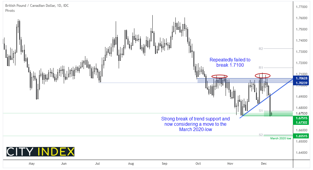 这是今年最后一次加央行会议,预计利率维持在0.25%。然而,鉴于经济学家预计2022年将有四次加息,他们也会希望此次会议能一定程度上确认预期。因此,如果央行未及人们希望的那般鹰派,反向交易策略为做空加元,而最大的看涨意外(不过不太可能)将是央行出手加息。英镑/加元在会议开始前处于一个关键支撑,从而为市场交易提供了一个明确关口水平。