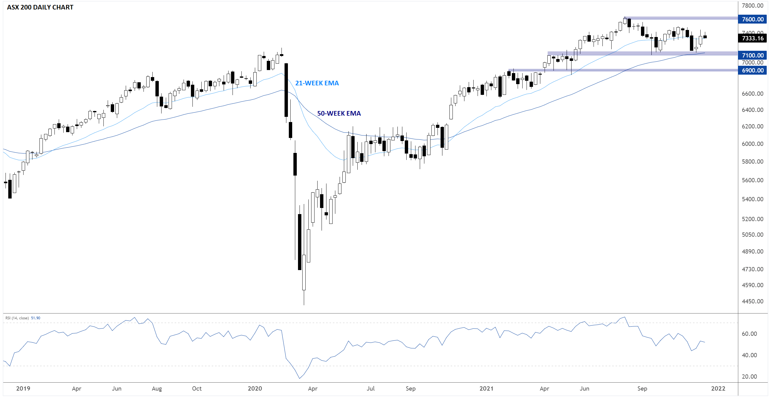 最后同样重要的是澳大利亚的ASX200指数。该股指于8月初触顶后似乎在今年下半年丧失动能,目前交易于七个月最低点,并且明显带着区间横盘的势头进入2022年。该区间的强支撑在当前价位下方不远处的7100附近,而阻力在7600附近。如果摆脱该持续7个月之久的区间,可望奠定接下来一年朝突破方向持续前进的行情。