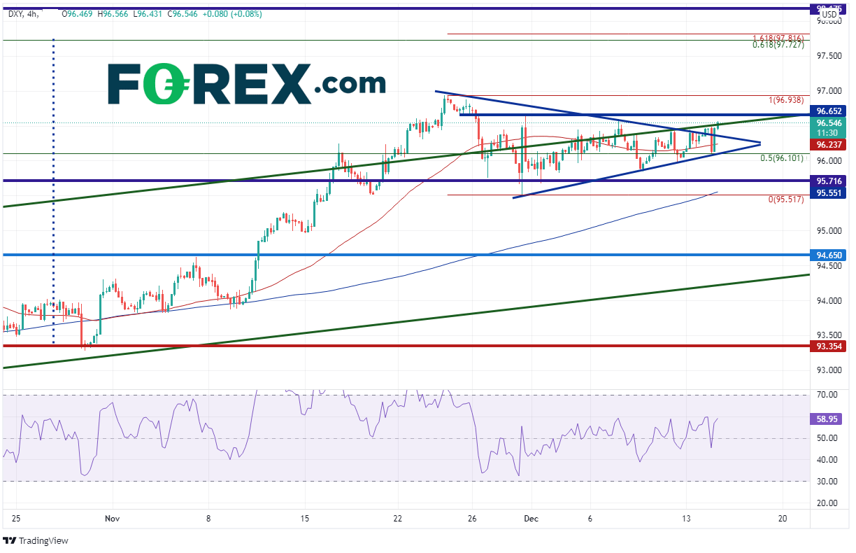 美元指数4小时图于周一打破三角形延续形态,攻击该长期上升三角形的上轨趋势线阻力,于周二收上该趋势线,有望上攻年内新高96.94,途中的唯一障碍是水平阻力位96.65。如果攻克,美元指数有望走向长期时间周期上双底形态的目标,即97.75附近(请看下方美元指数图左侧的蓝色竖线)。请注意,97.73/97.82有多个阻力相汇,包括2020年3月高点到2021年1月6日低点行情的61.8%回档位、11月24日高点到11月30日低点行情的161.8%扩展位。支撑位在三角形的上轨下斜趋势线96.38附近、50天均线96.24和三角形的上斜趋势线96.10附近。