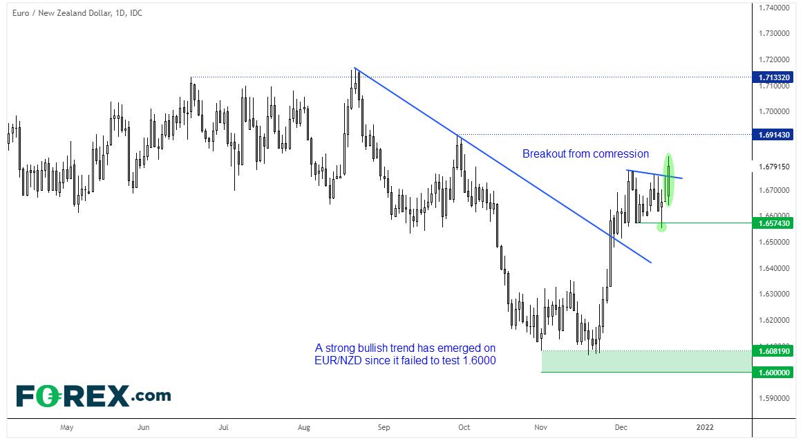 自从前跌势未能考验1.6000以来,欧元/纽元一直处于强劲的上涨趋势中。该货币对强力反弹并站上趋势线阻力,之后震荡横盘。但收出的十字星没有收于1.6600下方,表明低位有接盘,日图有望收上趋势线阻力。下个阻力在1.6914,站于其上的话上看1.7000和1.7100。