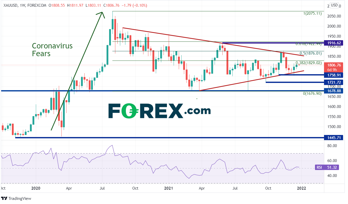 把进度条快进到今天我们发现,标普500指数相较其2020年低点已经翻了一番。2021年对产品与服务的需求回暖,造成供应跟不上,并带来通胀。美国FOMC在12月15日宣布,将于2022年3月结束量化宽松,而且FOMC成员预测2022年和2023年各有三次加息。交易者现在必须思考:随着各国央行减少货币供应,投资者何时将撤出股市?在供应端受制且通胀上升的背景下,投资者何时将进入黄金以及其它贵金属等避险资产?会是在2022年年初吗?