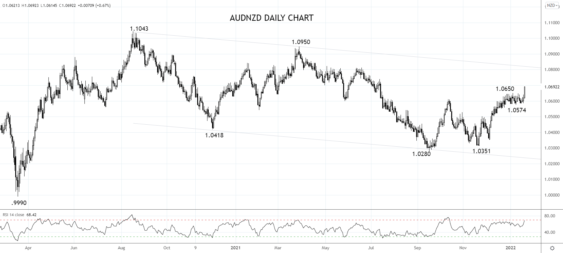 基于上述预期,我们可以利用汇价回落至1.0665/45时开立澳元/纽元多仓,目标是在1.0800/20价位了结获利。止损应设在2022年区间低点1.0565下方。